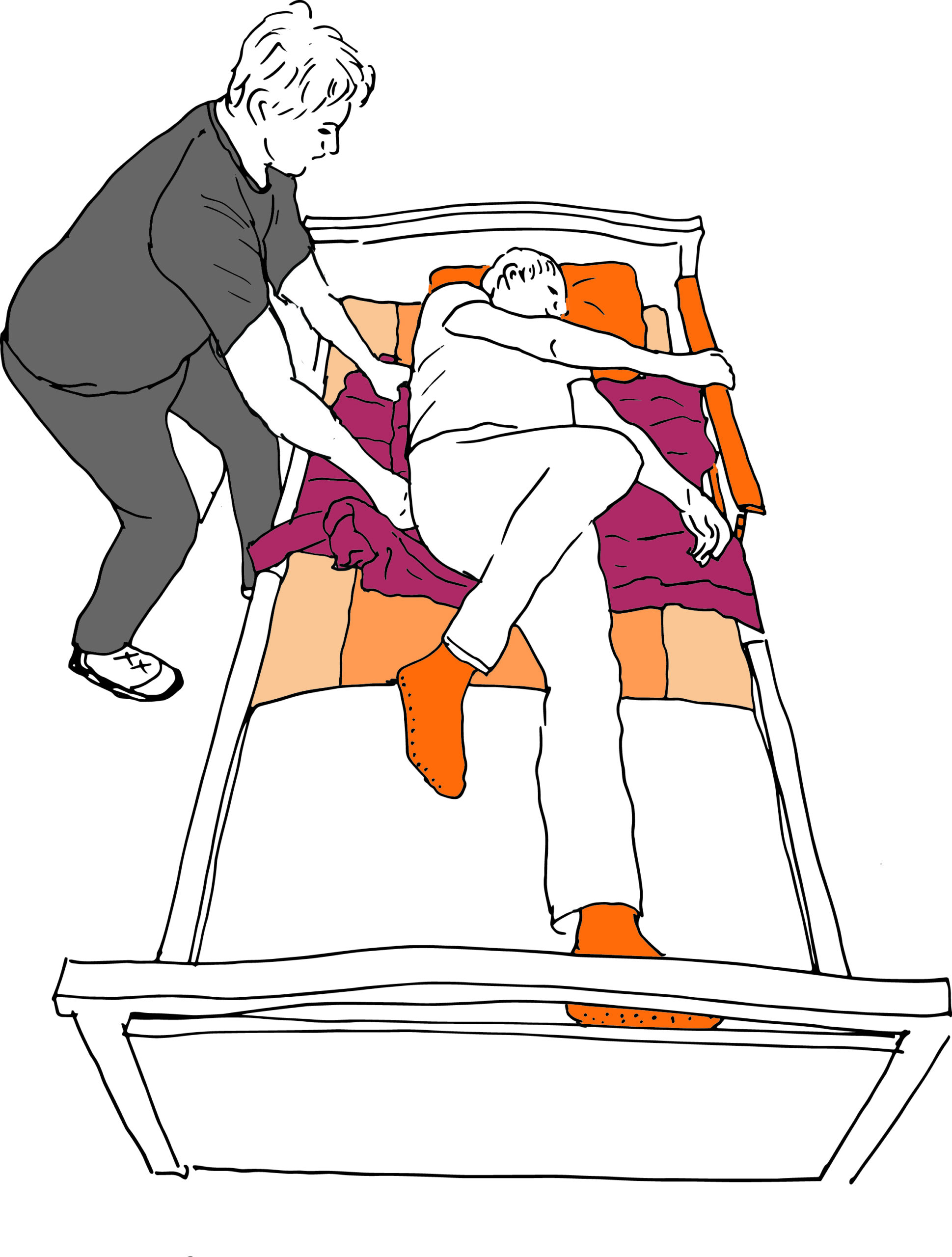 En vändning i säng med ett draglakan underlättas om sängen sänks till en lägre höjd. Ställ dig i gångstående och greppa draglakanet vid kontaktpunkterna närmast patienten. Flytta din kroppstyngd från det främre benet till det bakre. Kom ihåg att dosera din kraft med låg hastighet så att vändningen sker skonsamt för er bägge.