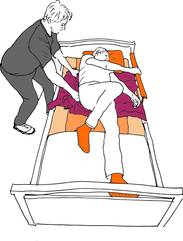 1. Vändning i säng Visste du att den kraft man behöver utöva genom att dra ett draglakan reduceras med över 50% om patienten får bägge benen böjda, vrider huvudet åt det håll hen skall vända sig mot, för armen över bröstet och ökar spänningen i kroppen generellt? Drar du dessutom långsamt reduceras kraften ytterligare.